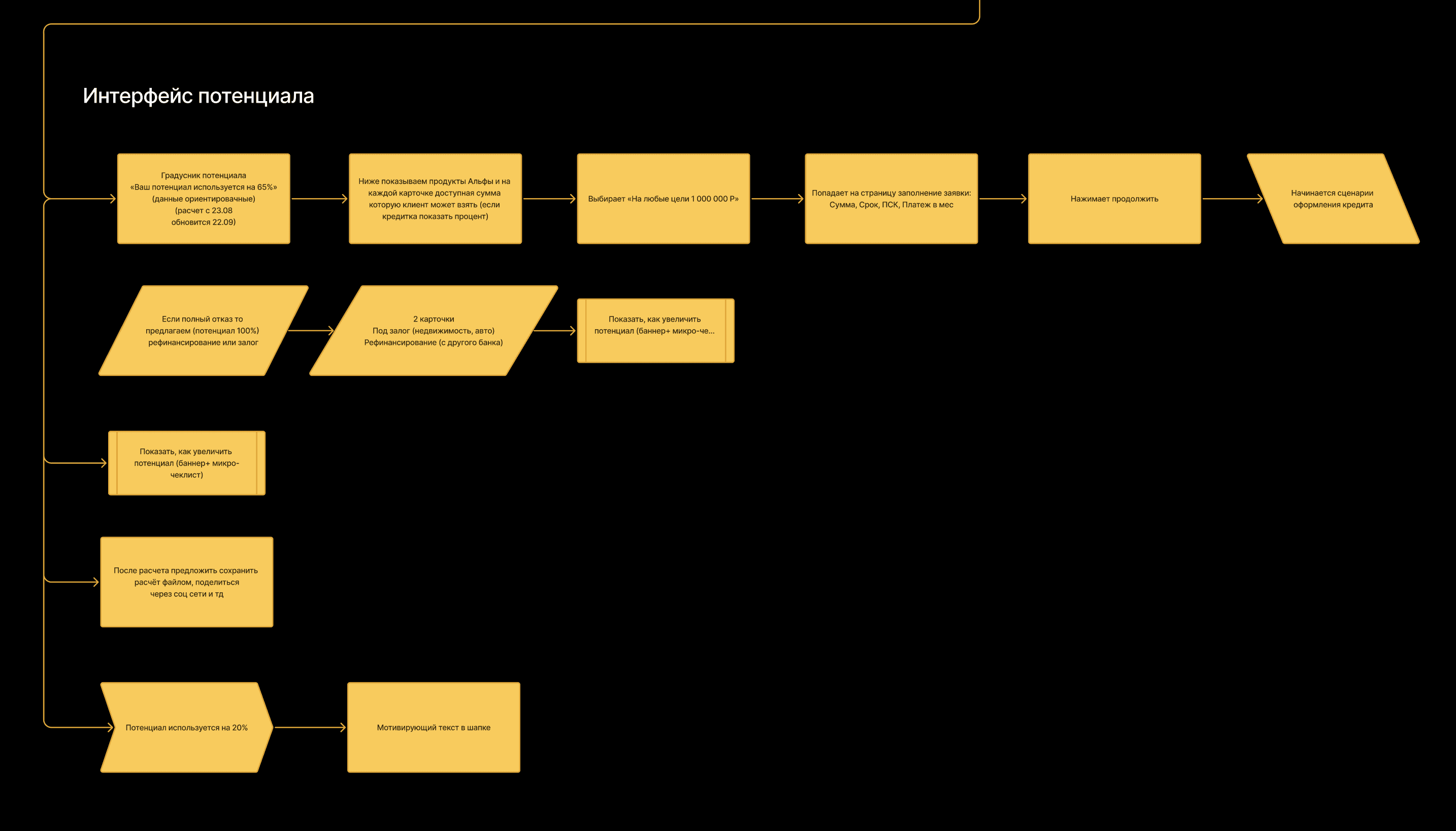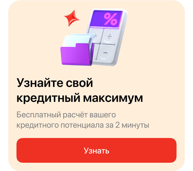 Кредит наличными → Кнопка в калькуляторе «Узнать бесплатно сколько банк может одобрить» / Баннер «Хотите узнать свой кредитный максимум?»→ Заполнение короткой формы → Подождите 2 мин → Ваш потенцил 65% / Отказ рекомендуем залог или рефинанс, так же советы по лимитам